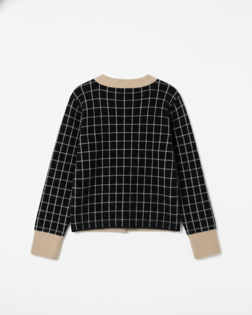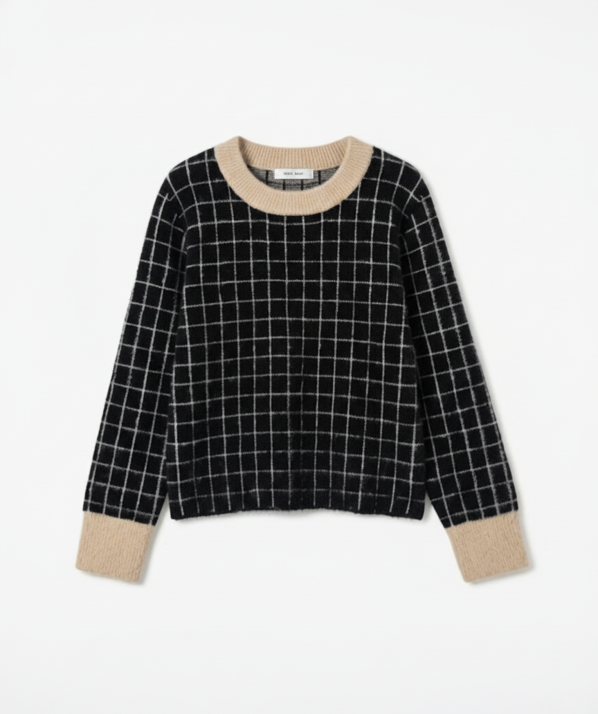 Women’s 100% Polyamide Windowpane Check Sweater – Soft-Touch Brushed Yarn | Custom Knitwear Manufacturer