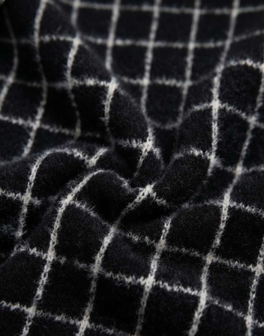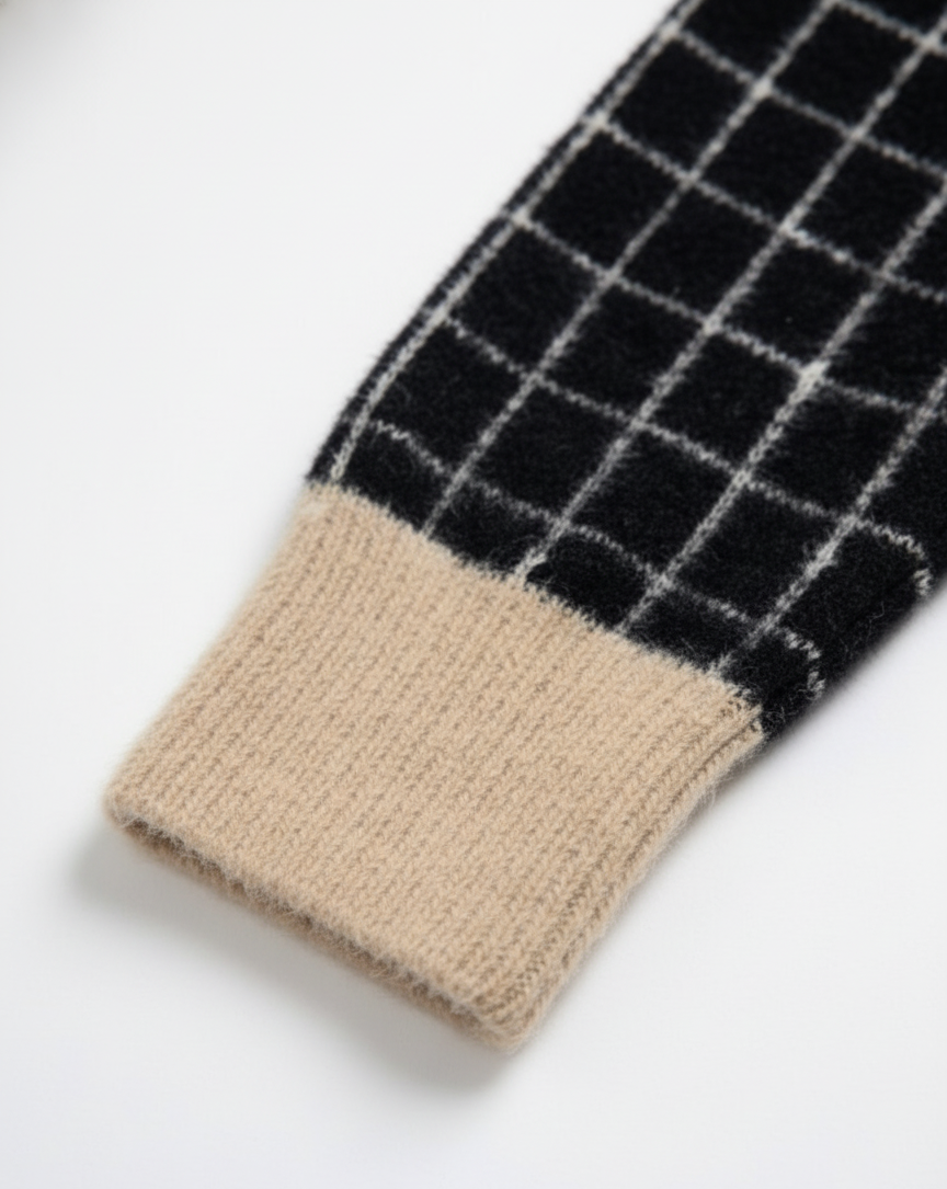 Showcasing our factory’s expertise in synthetic fiber manipulation, this Women’s Windowpane Check Sweater is a prime example of high-quality 100% Polyamide production. This piece demonstrates our ability to create garments that offer the luxurious hand-feel of natural wools with the superior durability and versatility of advanced synthetics. This prototype highlights our capabilities in jacquard patterning, color block detailing, and soft-texture finishing.